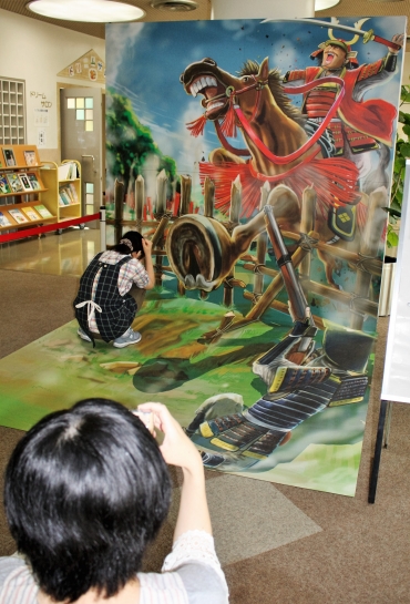 長篠設楽原の戦いを表現したトリックアート看板 東愛知新聞
